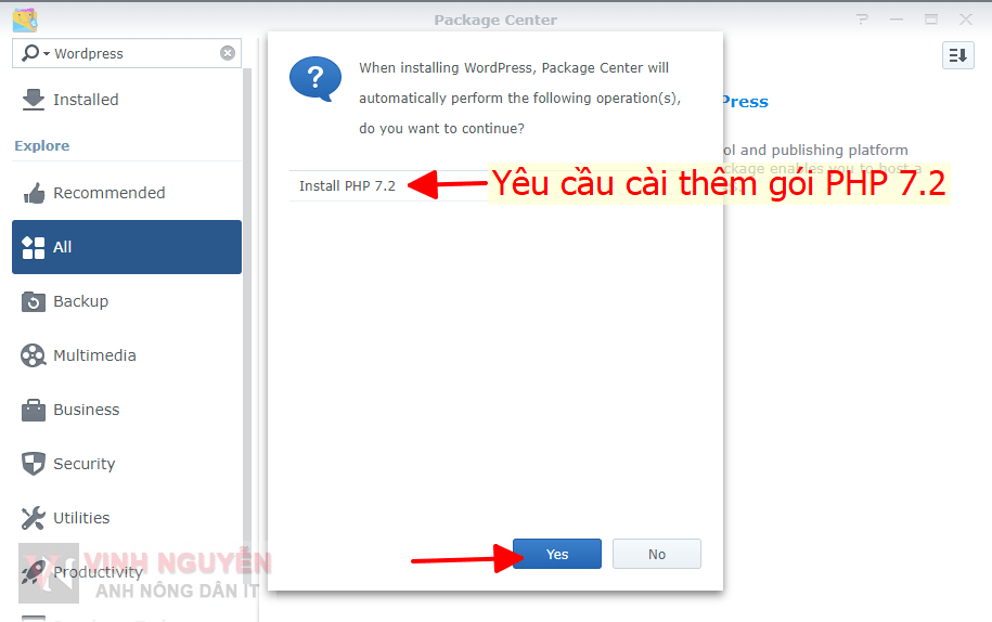 Bản WordPress trong Package Center sẽ chạy với PHP 7.2. Nếu bạn chưa cài sẽ yêu cầu cài thêm.