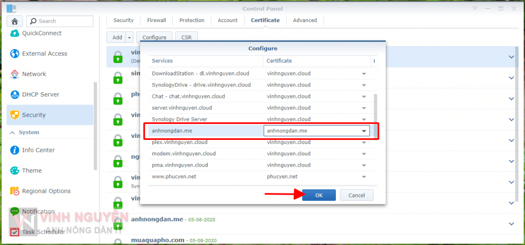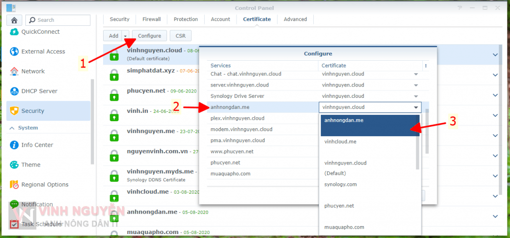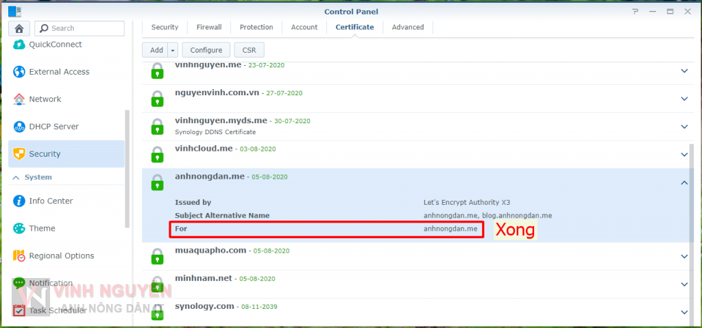 - Nếu tên miền của bạn đã tạo SSL và đặt là chứng chỉ mặc định thì xong, không phải thao tác gì nữa. Vì Synology DSM sẽ tự add về chứng chỉ mặc định. Trong trường hợp không phải chứng chỉ mặc định bạn cần phải cấu hình lại như sau.
