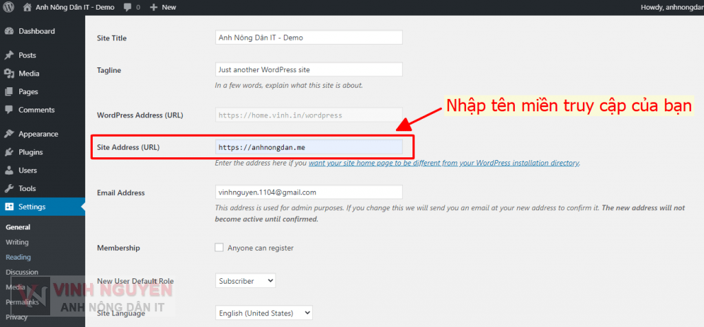 B4: Thay đổi lại địa chỉ truy cập trong WordPress Settings