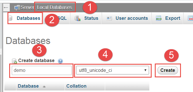• (1) Quay trở về giao diện trang chủ phpMyAdmin.