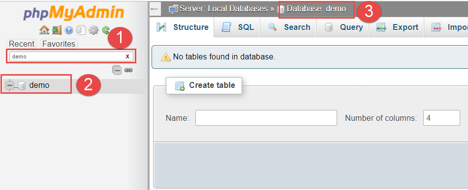 • (1) Tìm kiếm cơ sở dữ liệu theo tên (ví dụ: tên cơ sở dữ liệu vừa tạo).
