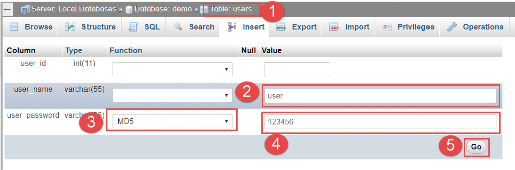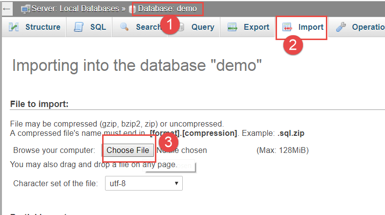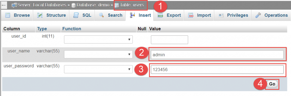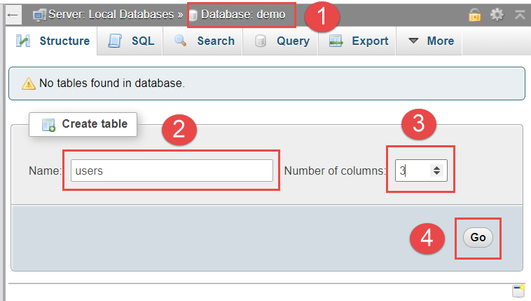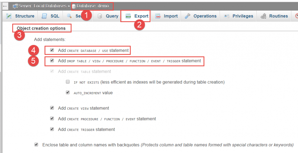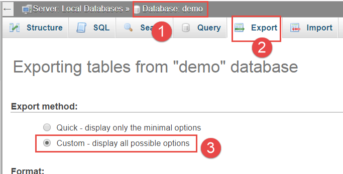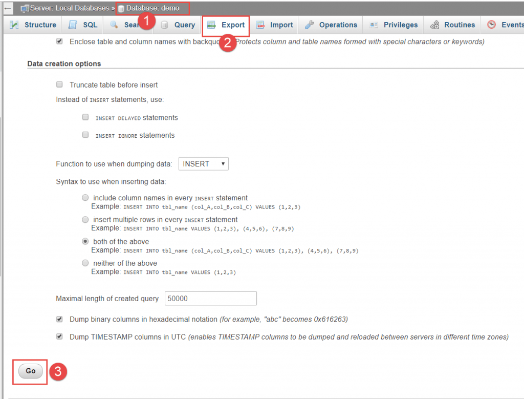 Sau khi đã thiết lập trong các bước trên, nhấn Go tại vị trí (3) để lưu thành file. Gợi ý: cách đặt tên file trùng với tên cơ sở dữ liệu. Ví dụ: demo.sql.