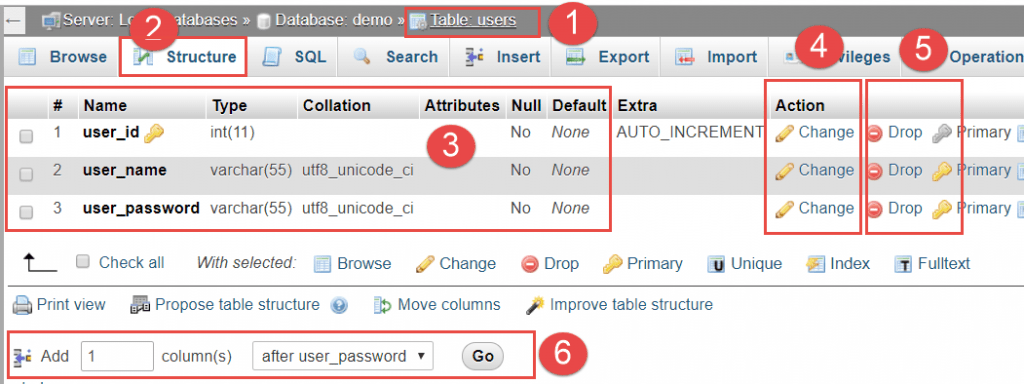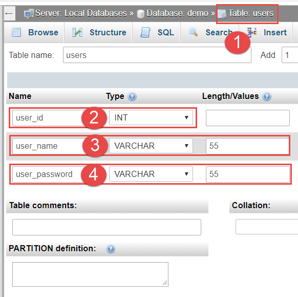 • (2) + (3) + (4) Nhập tên cột, kiểu giá trị (số: INT, chuỗi: VARCHAR) và chiều dài giá trị.