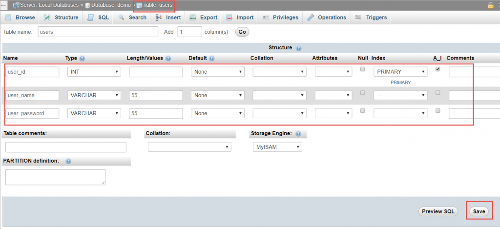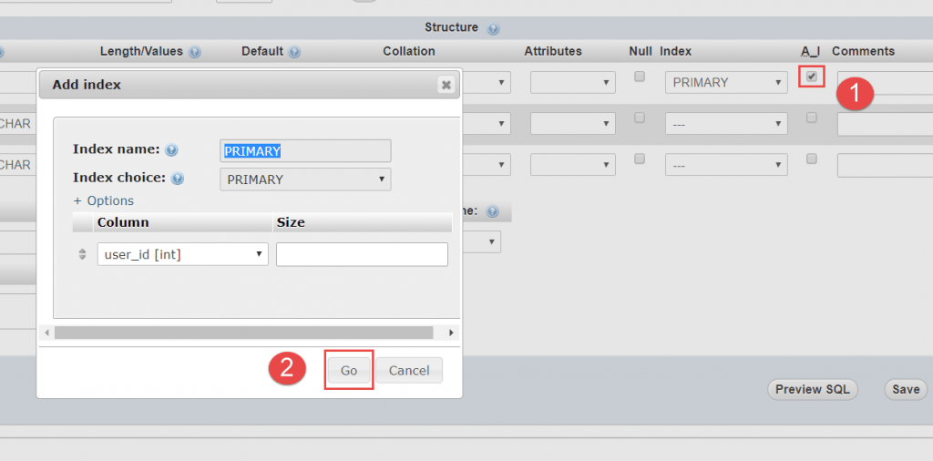 • (1) Tại cột chọn làm khóa chính, chọn mục A_I (Auto Increment). Ý nghĩa: cột này có giá trị tự tăng dần khi thêm dữ liệu vào bảng. Ví dụ: thêm dòng đầu tiên sẽ có giá trị 1, dòng thứ 2 sẽ có giá trị 2, … Chú ý rằng: cột này không được tự ý nhập vào.