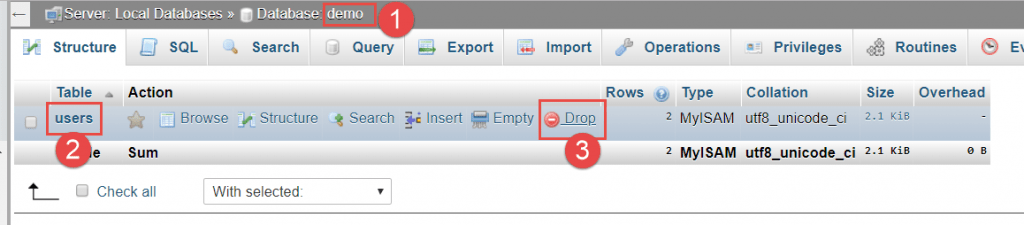 • (3) Chọn Drop để xóa bảng.