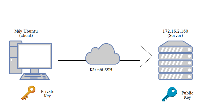 Cơ bản thì ở máy khách sẽ tiến hành tạo cặp key là private key và public key, sau đó sẽ gửi key public tới máy chủ và giữ lại private key. Khi muốn thực hiện đăng nhập từ xa, máy khách sẽ gửi yêu cầu kèm key private tới máy chủ. Máy chủ sẽ tiến hành kiểm tra private key có trùng với public Key không. Nếu có thì sẽ đăng nhập thành công.