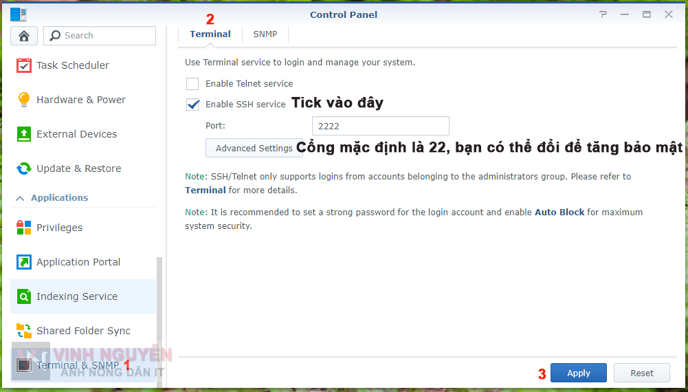 • Lưu ý: Để an toàn thì bạn nên đổi cổng truy cập của SSH service. Và khi dùng xong thì bạn quay lại Control Panel tắt SSH service đi, lúc nào cần thì bật lại.
