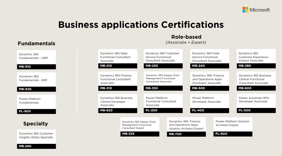 - Business applications Certifications: Các chứng chỉ này tập trung khả năng sử dụng Microsoft Dynamics 365, Power Platform, và các công cụ quản lý quy trình kinh doanh khác.
