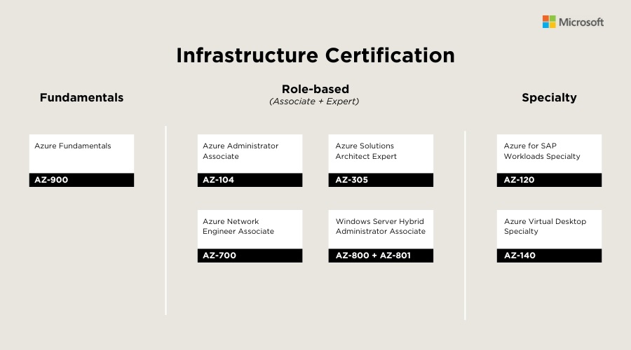 Chứng chỉ Infrastructure của Microsoft là các chứng chỉ được thiết kế để xác nhận kỹ năng và kiến thức của các chuyên gia trong việc quản lý và triển khai hạ tầng công nghệ thông tin. Những chứng chỉ này giúp các chuyên gia IT nắm vững các công nghệ của Microsoft để quản lý, bảo trì và tối ưu hóa hệ thống hạ tầng trong doanh nghiệp. Bao gồm các chứng chỉ: